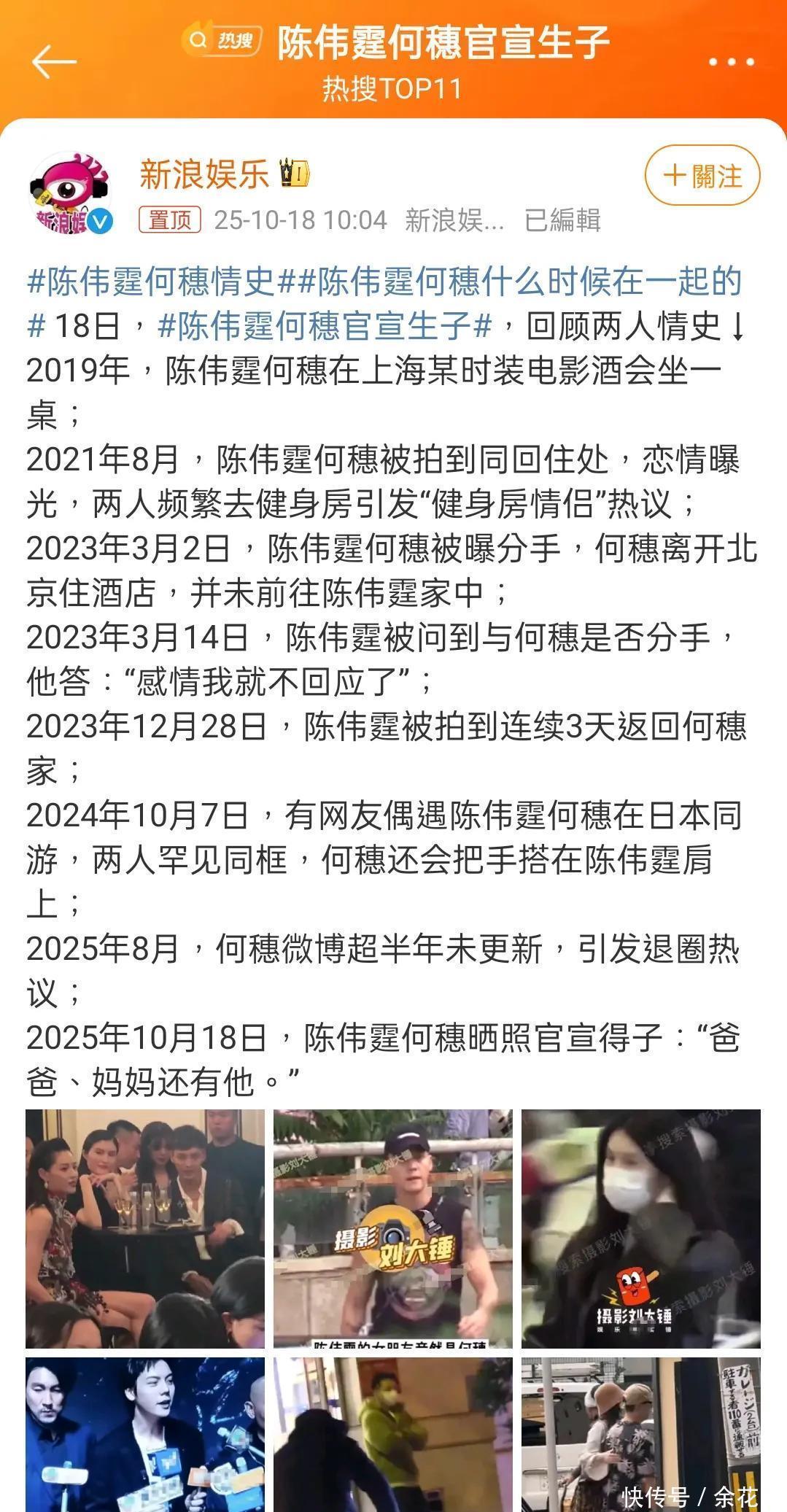 每天都在吃瓜第一线的本宝和网友们同时发出惊讶——他们什么时候在一起的这也藏得太严实了吧,孩子都生了才官宣!有媒体整理了两个人的恋情时间线:2019年,陈伟霆何穗在上海某时装电影酒会坐一桌。2021年8月,陈伟霆何穗被拍到同回住处,恋情曝光,两人频繁去健身房引发“健身房情侣”热议。2023年3月2日,陈伟霆何穗被曝分手,何穗离开北京住酒店,并未前往陈伟霆家中。2023年3月14日,陈伟霆被问到与何穗是否分手,他答:“感情我就不回应了”。2023年12月28日,陈伟霆被拍到连续3天返回何穗家。2024年10月7日,有网友偶遇陈伟霆何穗在日本同游,两人罕见同框,何穗还会把手搭在陈伟霆肩上。2025年8月,何穗微博超半年未更新,引发退圈热议。2025年10月18日,陈伟霆何穗晒照官宣得子:“爸爸、妈妈还有他。”